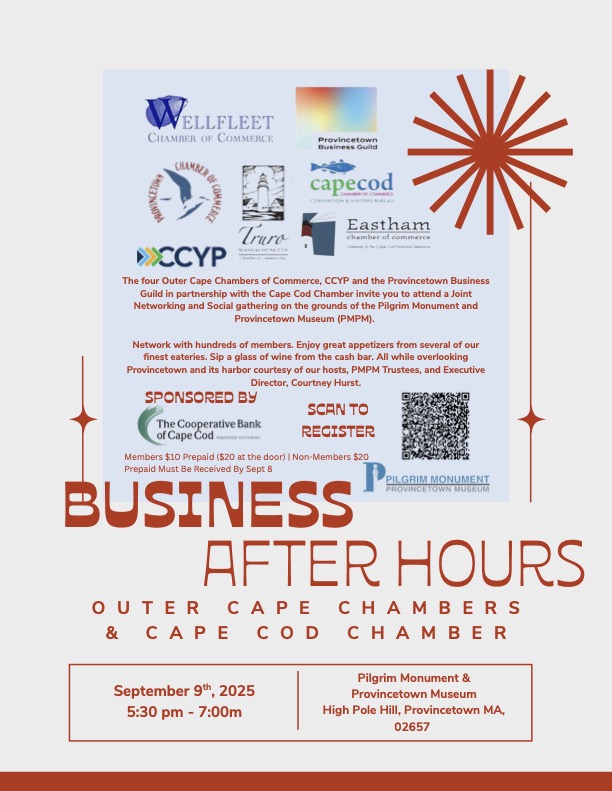The four Outer Cape Chambers of Commerce, CCYP and the Provincetown Business Guild in partnership with the Cape Cod Chamber invite you to attend a Joint Networking and Social gathering on the grounds of the Pilgrim Monument and Provincetown Museum (PMPM).